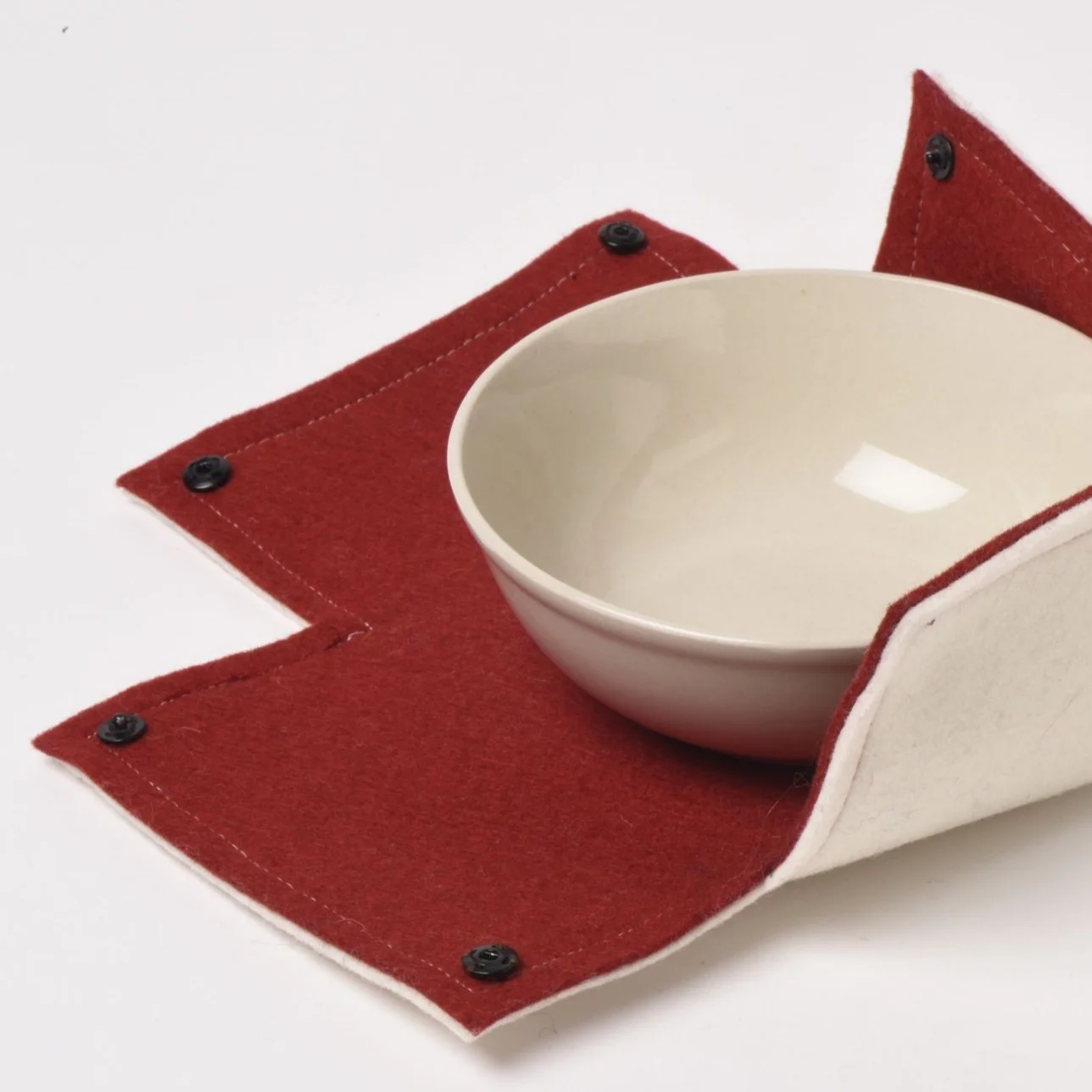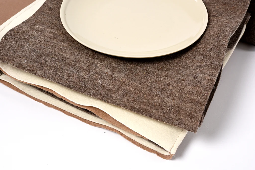 The idea for the plates transporter was developed using a paper model. The plates transporter is made from wool felt. The plates are gently embedded and protected. Felt is insulated well and can be preheated to keep the plates warm longer. It is very variable: You can open it as a tablecloth or use as placemat store for plates. This design object is usefull for transporting the plates.