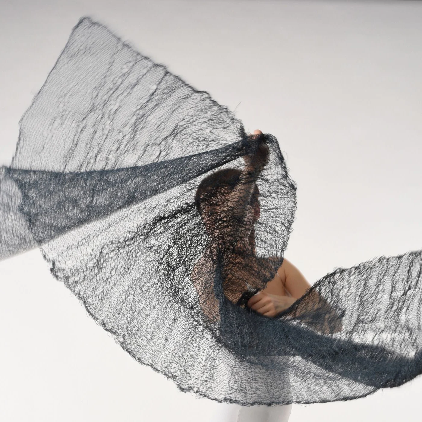 The knit surfaces are formed with porous, elastic structures. The use of special Pemotex- and Recytex yarns mixed with sheep’s wool, heckling combs, and steel wool allows a translucent, perforated, elastic, multilayered knitted fabric. Fabrics made from these materials are heat resistant, soundabsorbing, and flameretardant.